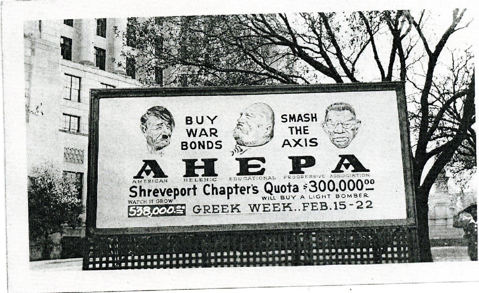 FEBRUARY, 1943: AHEPA Chapter 8, Shreveport, LA held 3 War Bond drives during the early ‘40s in order to help our country in its war effort. The 3rd drive began Dec, 1942 and ended Feb 22, 1943. This drive underwrote the purchase of a B-17 Bomber, its quota being $125,000, but Bond Sales exceeded $500,000. The aircraft was named after the Shreveport chapter, and the name printed on the nose of the aircraft was, SHREVEPORT AHEPA CHAPTER NO. 8. A lengthy article and photograph were printed in the Shreveport Journal, 17 August 1944.